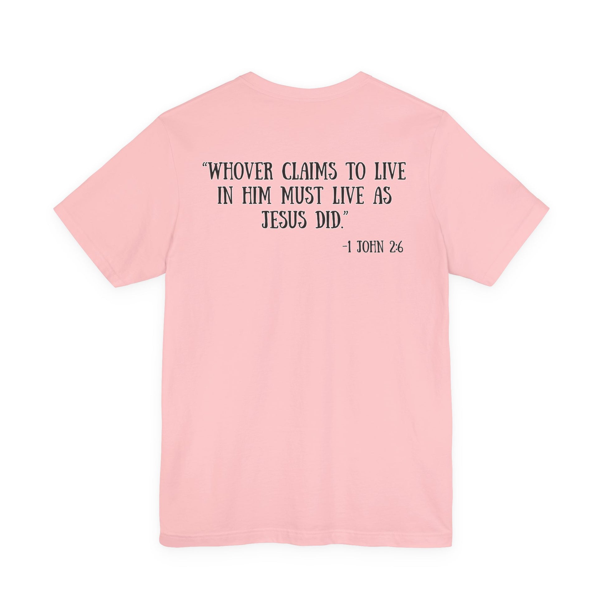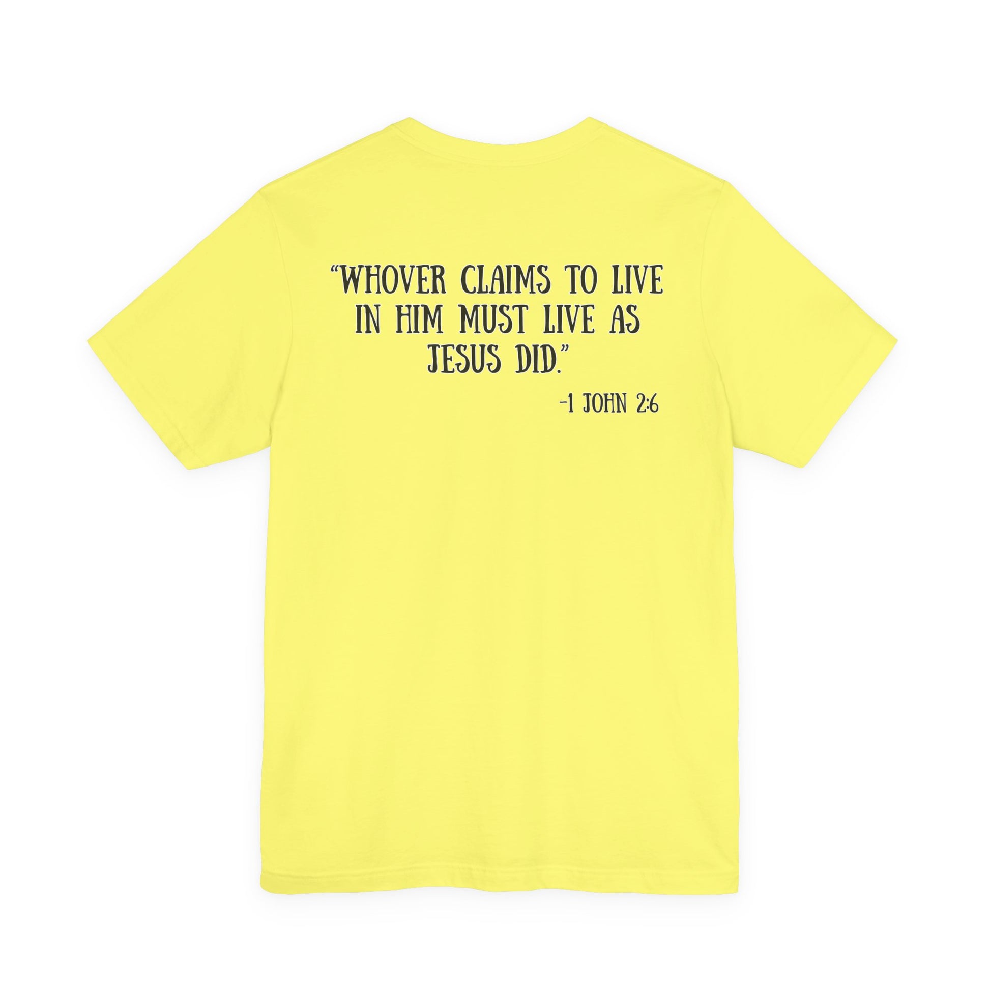 This lightweight cotton tee carries a quiet, faith-forward message with simple, vintage-inspired typography. The front features a small reference (“1 JOHN 2:6”) while the back expands the thought with the verse: “Whoever claims to live in Him must live as Jesus did.” The retail fit and crew neckline keep the silhouette clean and easy to layer under a jacket or wear on its own. Breathable Airlume combed cotton and thoughtful construction (side seams, ribbed collar, shoulder tape) make it comfortable for long wear. It wears like a lived-in staple that starts conversations—suitable for church gatherings, volunteer days, mission trips, or everyday reflection.