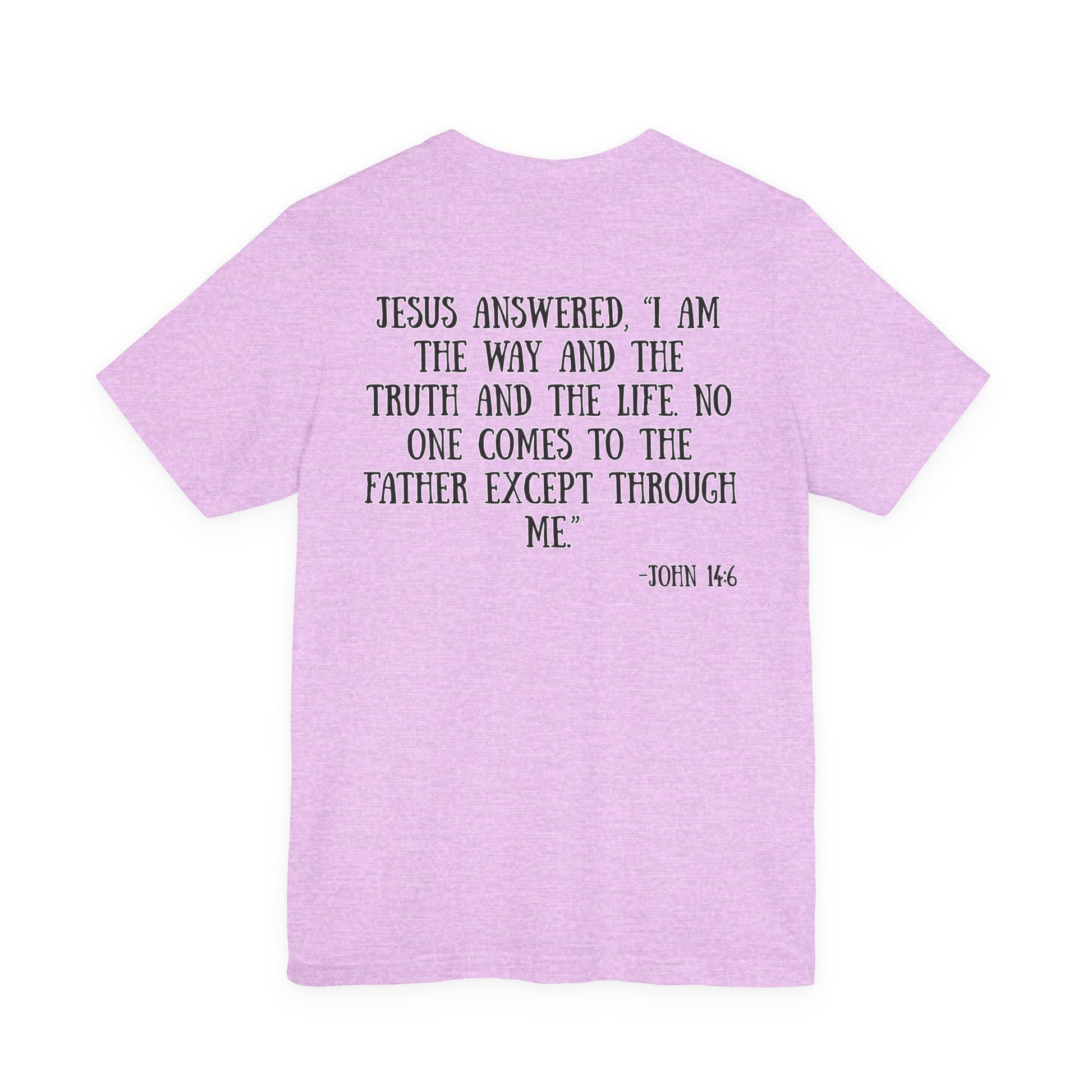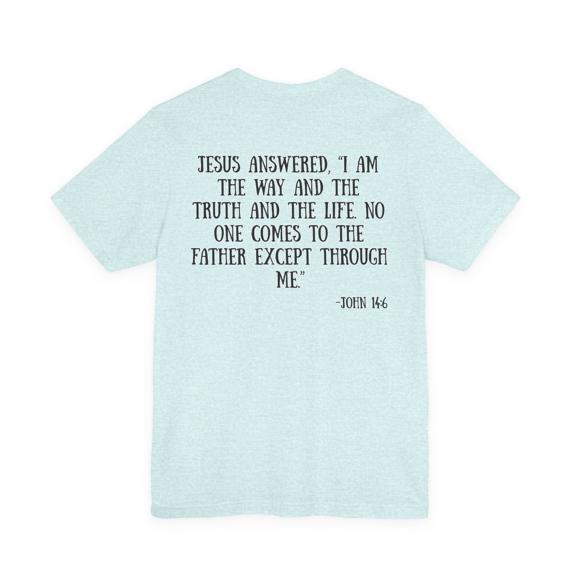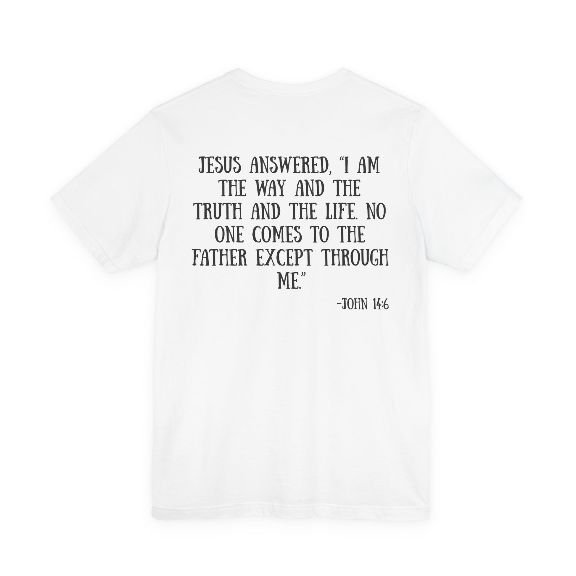 Soft, breathable cotton meets quiet proclamation. This lightweight jersey tee carries John 14:6 across the chest in a simple, vintage-inspired type, with the full verse printed across the back for a reflective, wearable testimony. It sits cleanly at the crew neck and falls in a relaxed retail fit — easy to layer under a jacket or wear alone during worship nights, outreach, or casual everyday moments. The understated, monochrome print keeps the message front-and-center without shouting, creating a calm, contemplative piece that lives comfortably in the wardrobe of someone who wants to share their faith with gentle confidence.