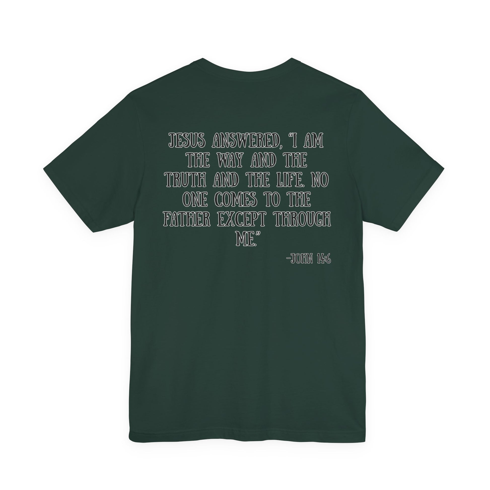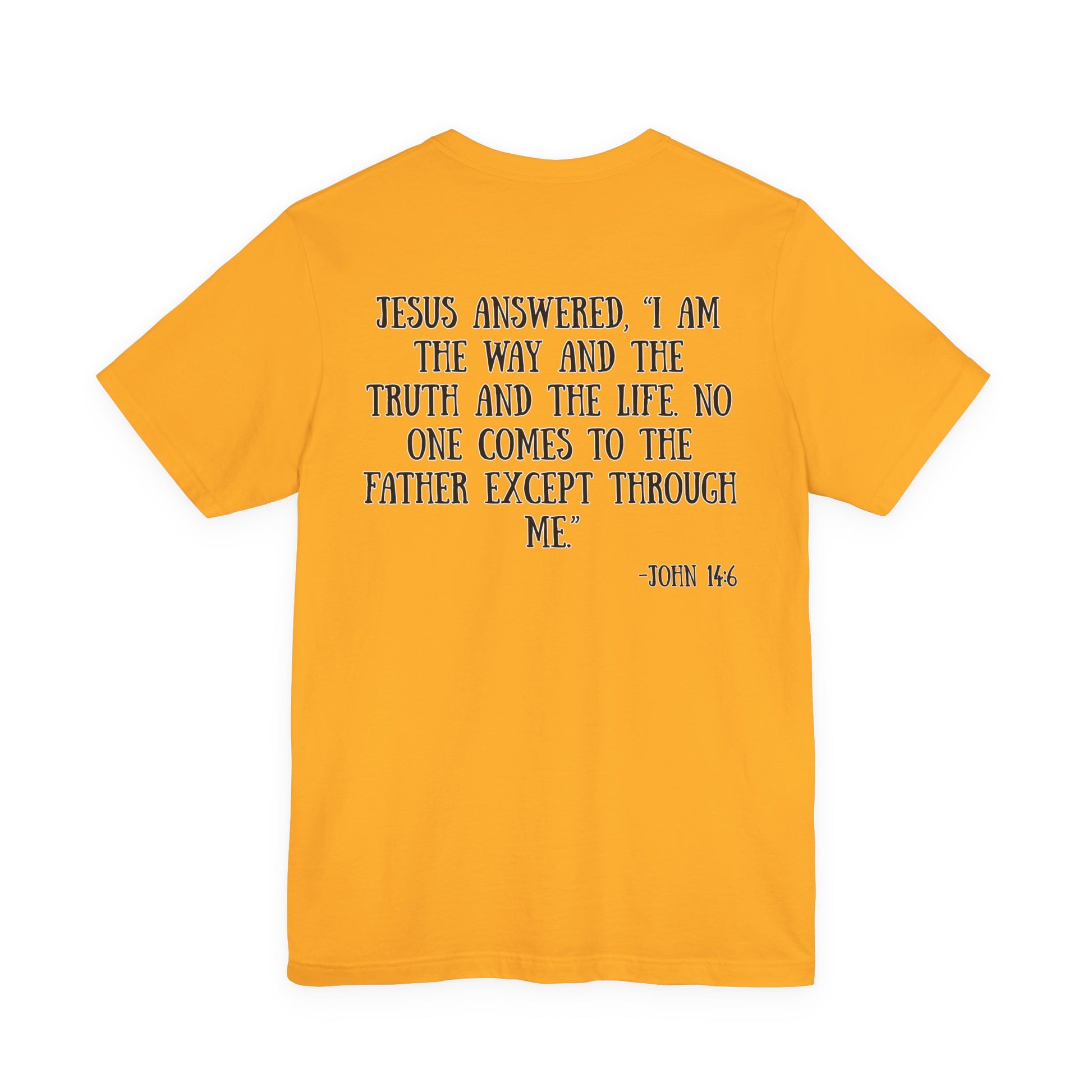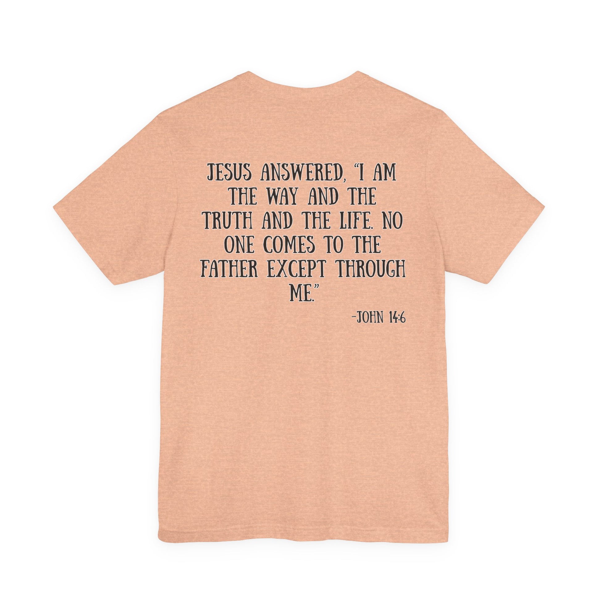Soft, breathable cotton meets quiet proclamation. This lightweight jersey tee carries John 14:6 across the chest in a simple, vintage-inspired type, with the full verse printed across the back for a reflective, wearable testimony. It sits cleanly at the crew neck and falls in a relaxed retail fit — easy to layer under a jacket or wear alone during worship nights, outreach, or casual everyday moments. The understated, monochrome print keeps the message front-and-center without shouting, creating a calm, contemplative piece that lives comfortably in the wardrobe of someone who wants to share their faith with gentle confidence.