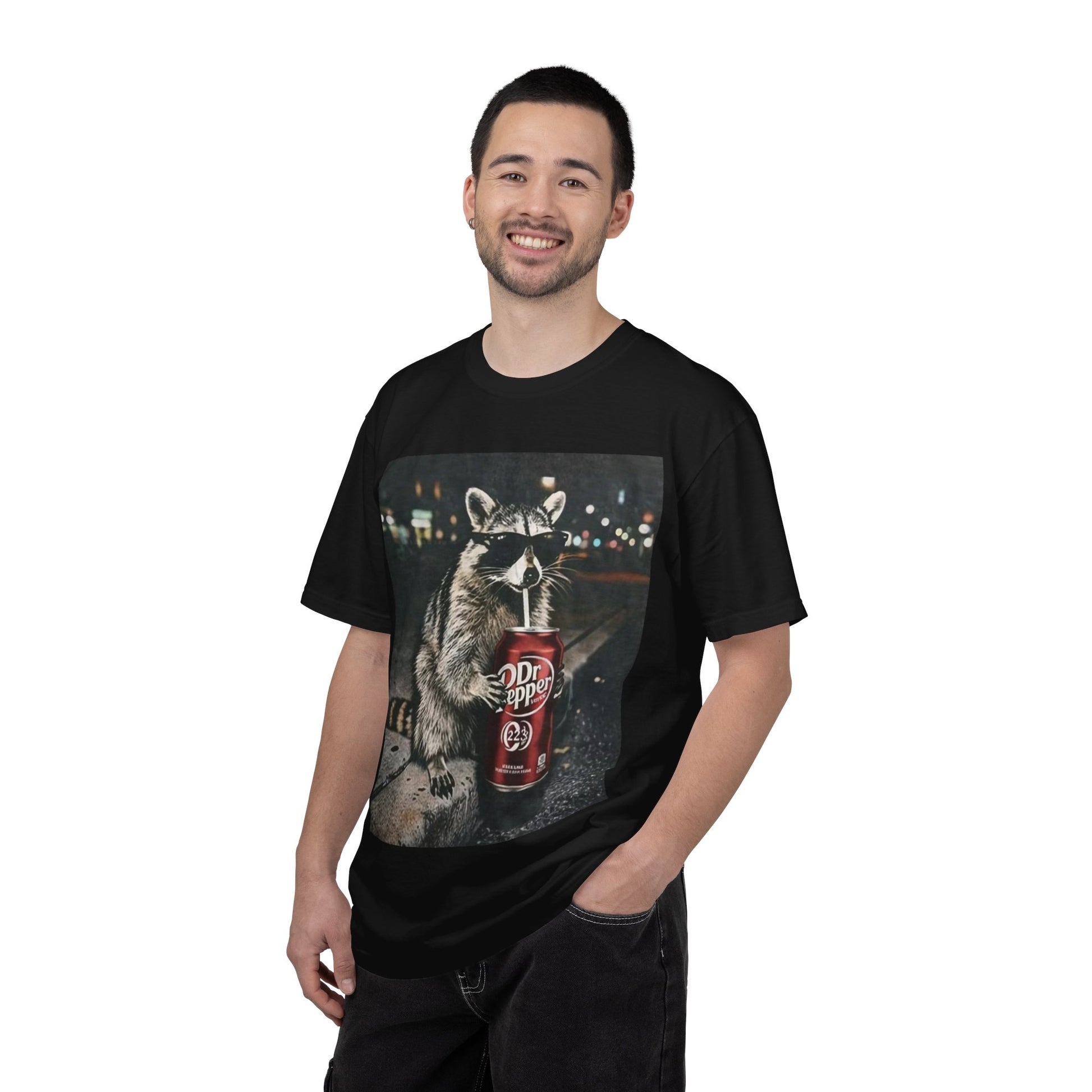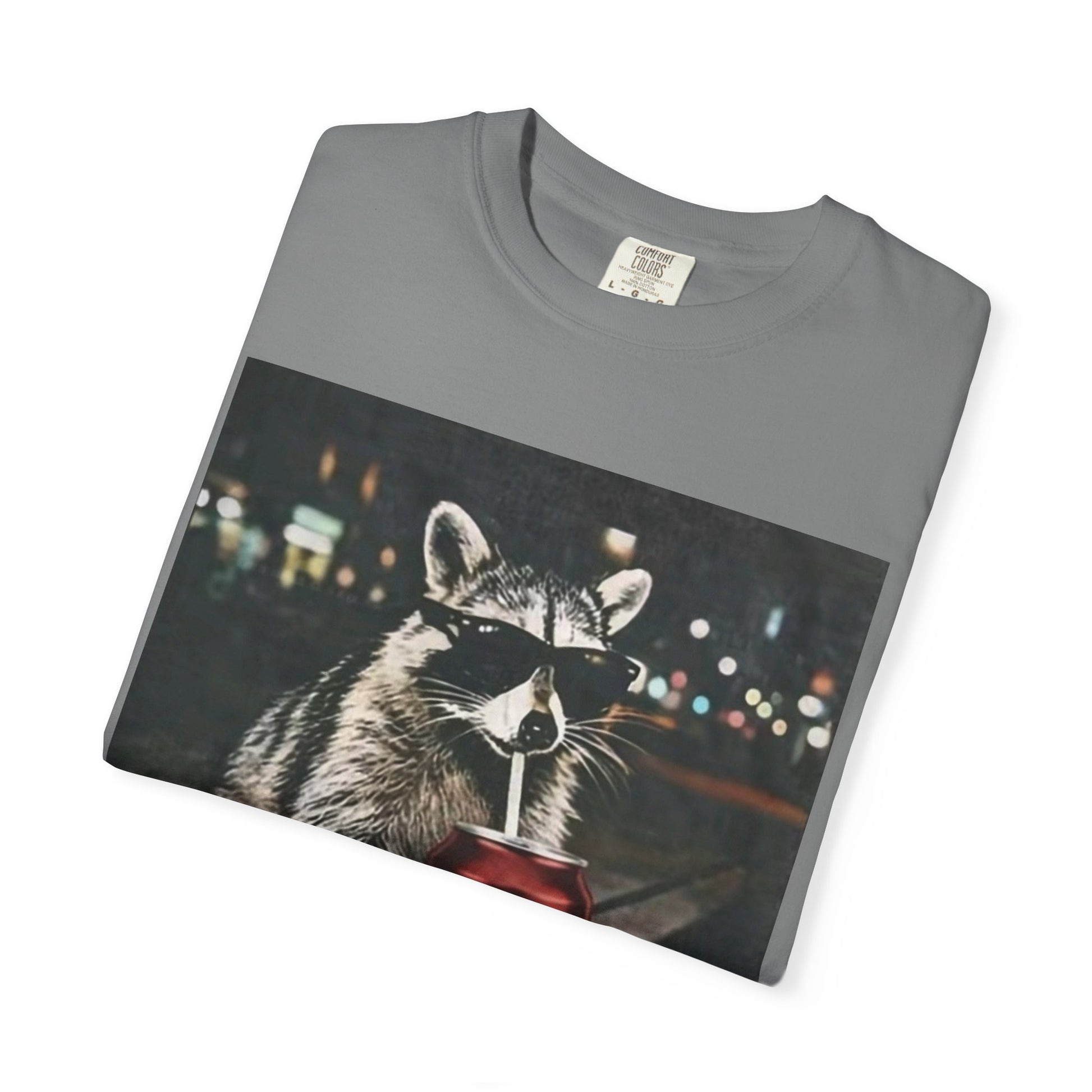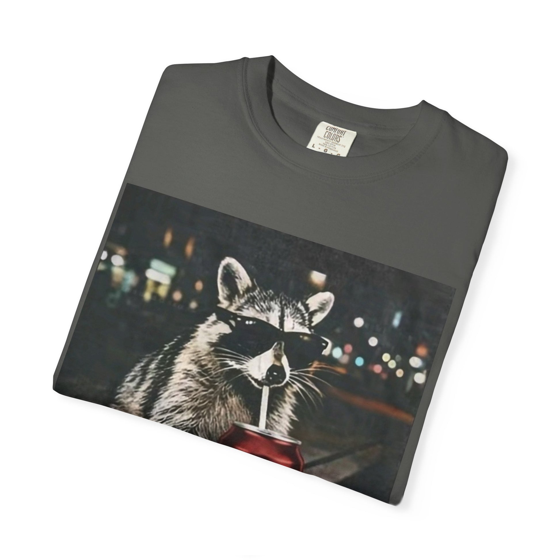 Soft, lived-in tee with a playful urban vibe. The garment-dyed cotton drapes with a relaxed, substantial feel — the kind of shirt you reach for on late-night walks, coffee runs, or low-key hangouts. The front print — a streetwise raccoon sipping a soda under city lights — brings a wink of mischief and personality without shouting. It wears like a favorite from day one: broken-in color, sturdy double-needle seams, and a roomy cut that layers easily over hoodies or stands alone. Let it be the comfortable, slightly irreverent staple in a casual rotation.