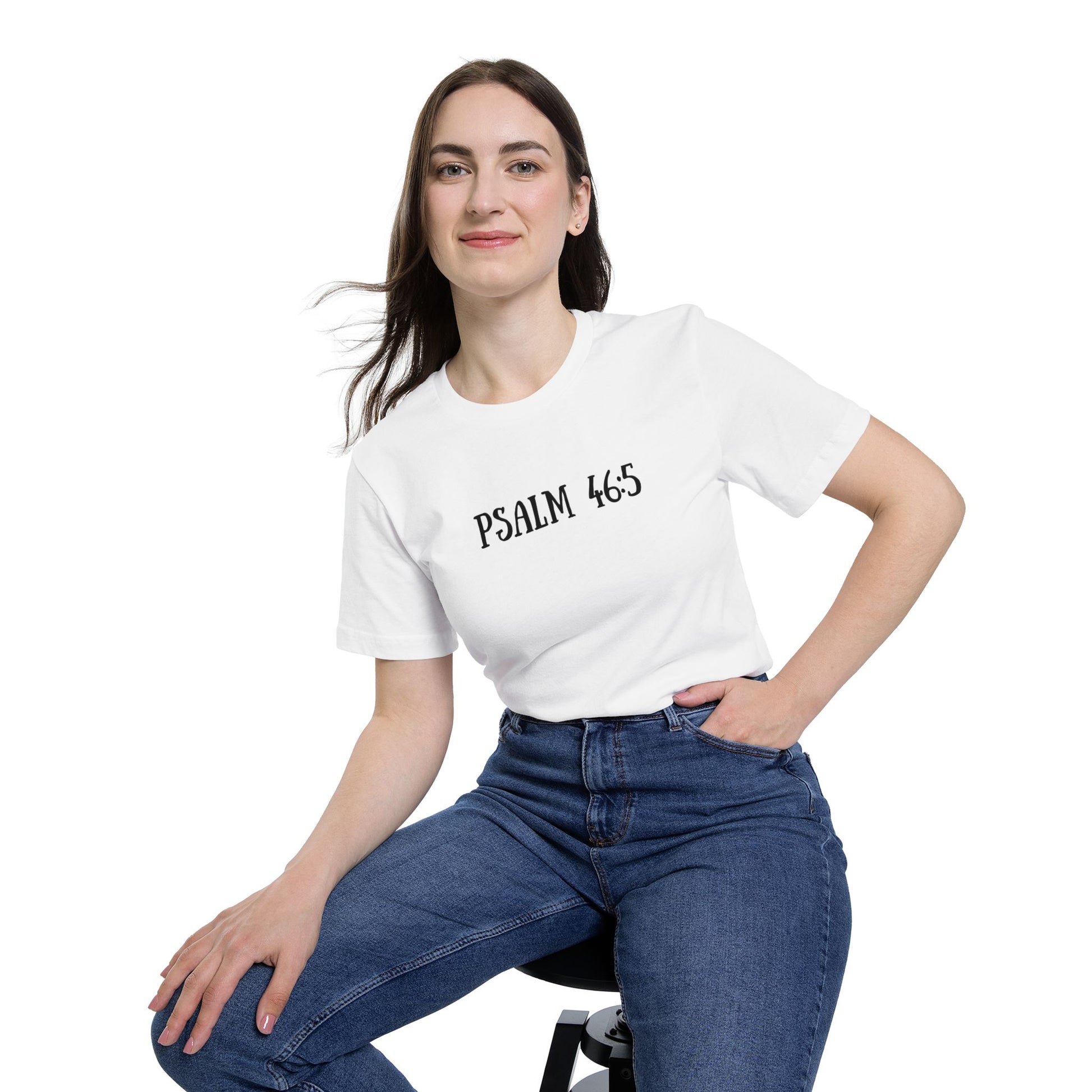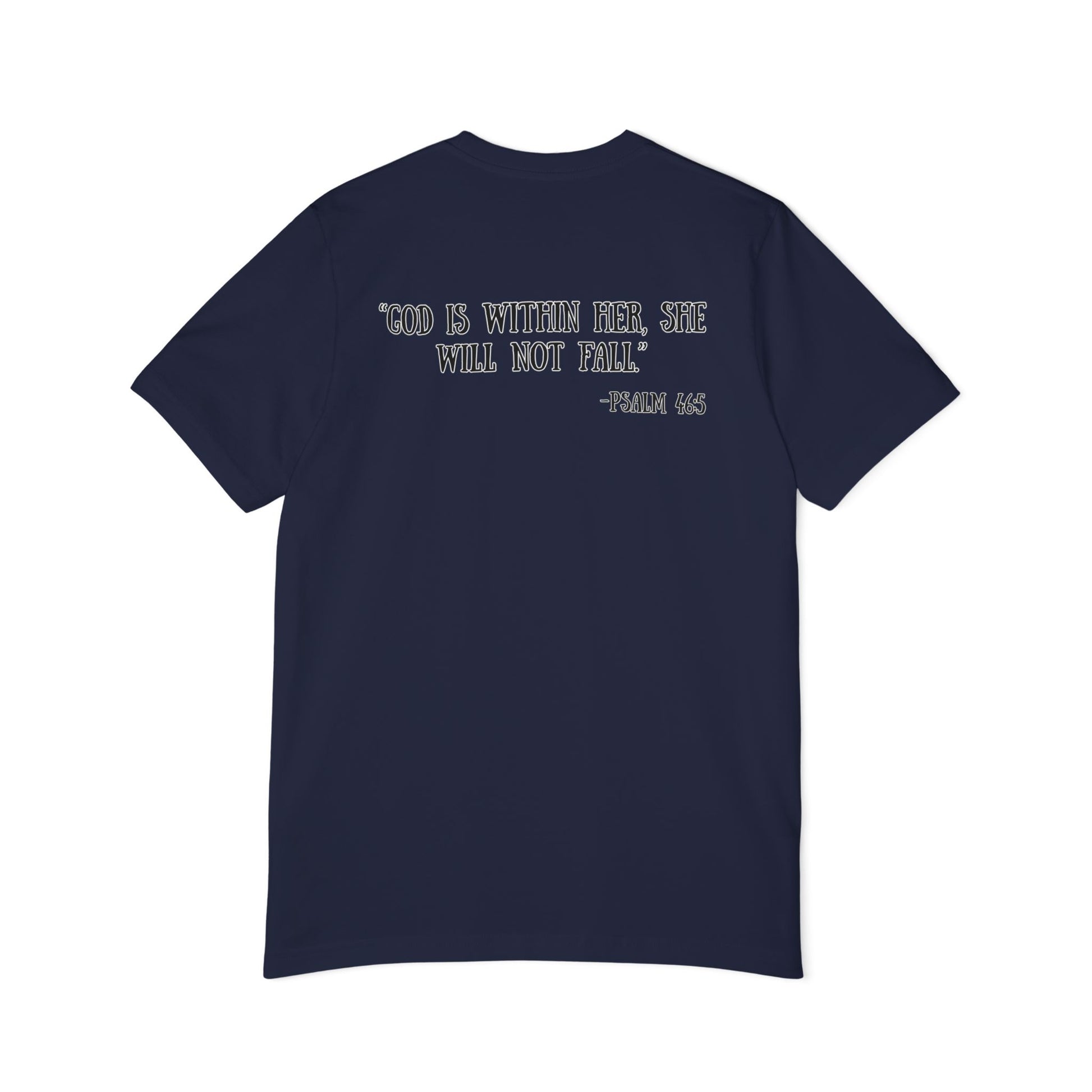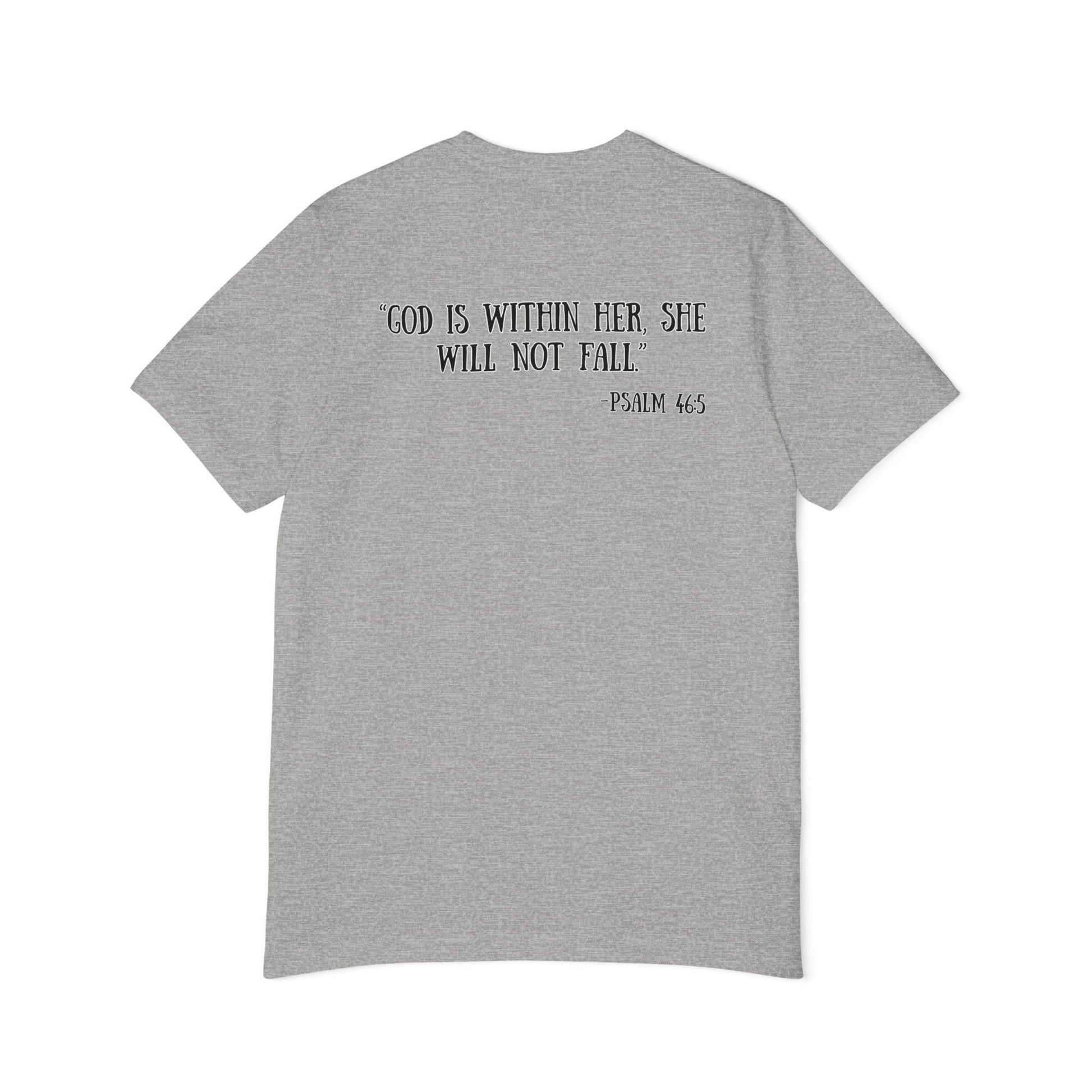 A lightweight, USA-made jersey tee that carries a quiet, steadfast faith. Clean lines and soft Airlume cotton make it easy to reach for on slow Sundays, quick mornings, and evenings of prayer. The front shows a simple “Psalm 46:5” while the back repeats the verse in a gentle, vintage type: “God is within her, she will not fall.” It sits close to the body without feeling tight, has durable shoulder taping to keep its shape, and a tear-away label for comfortable layering. Wear it to small group gatherings, volunteer days, or when you want a subtle reminder of steadiness and grace.
