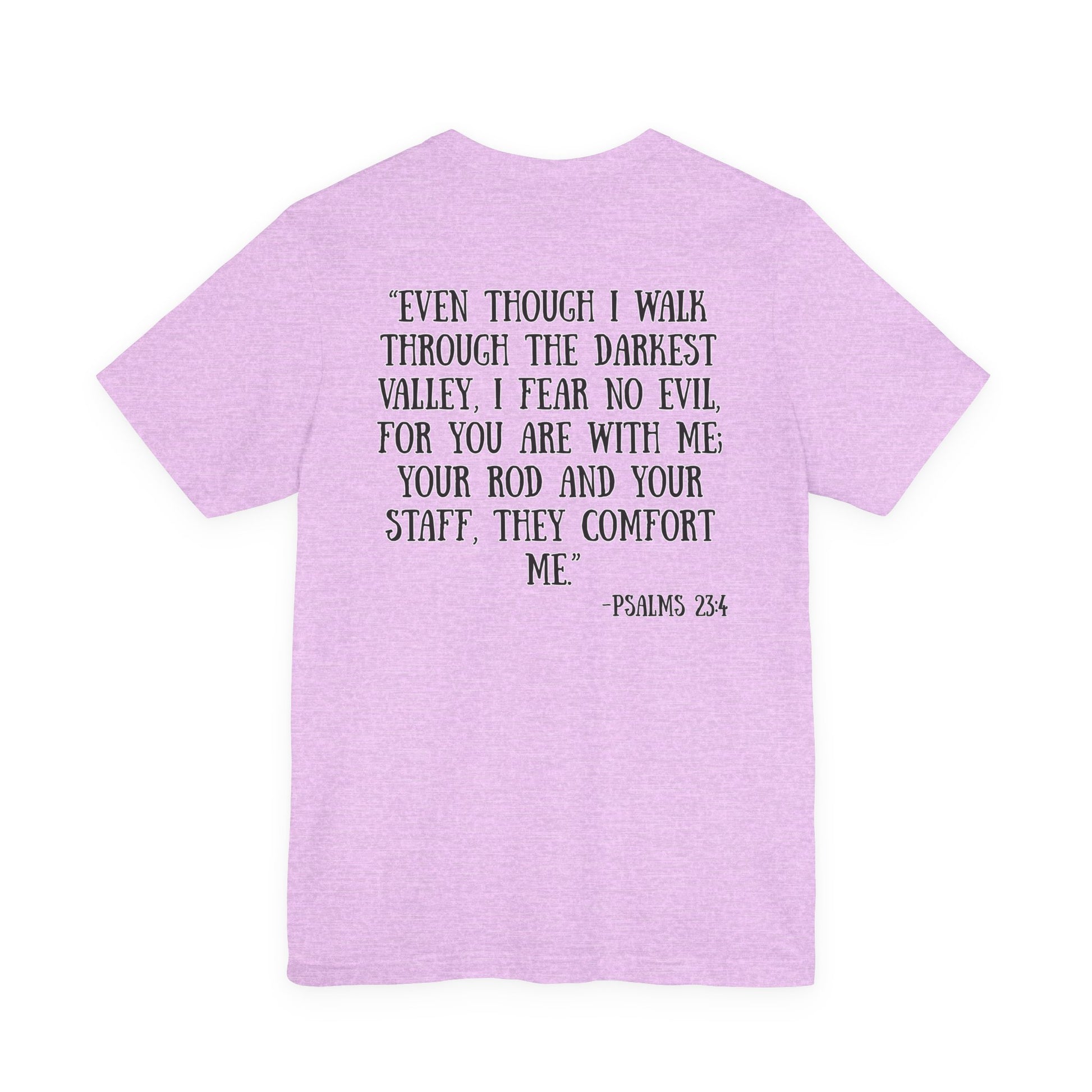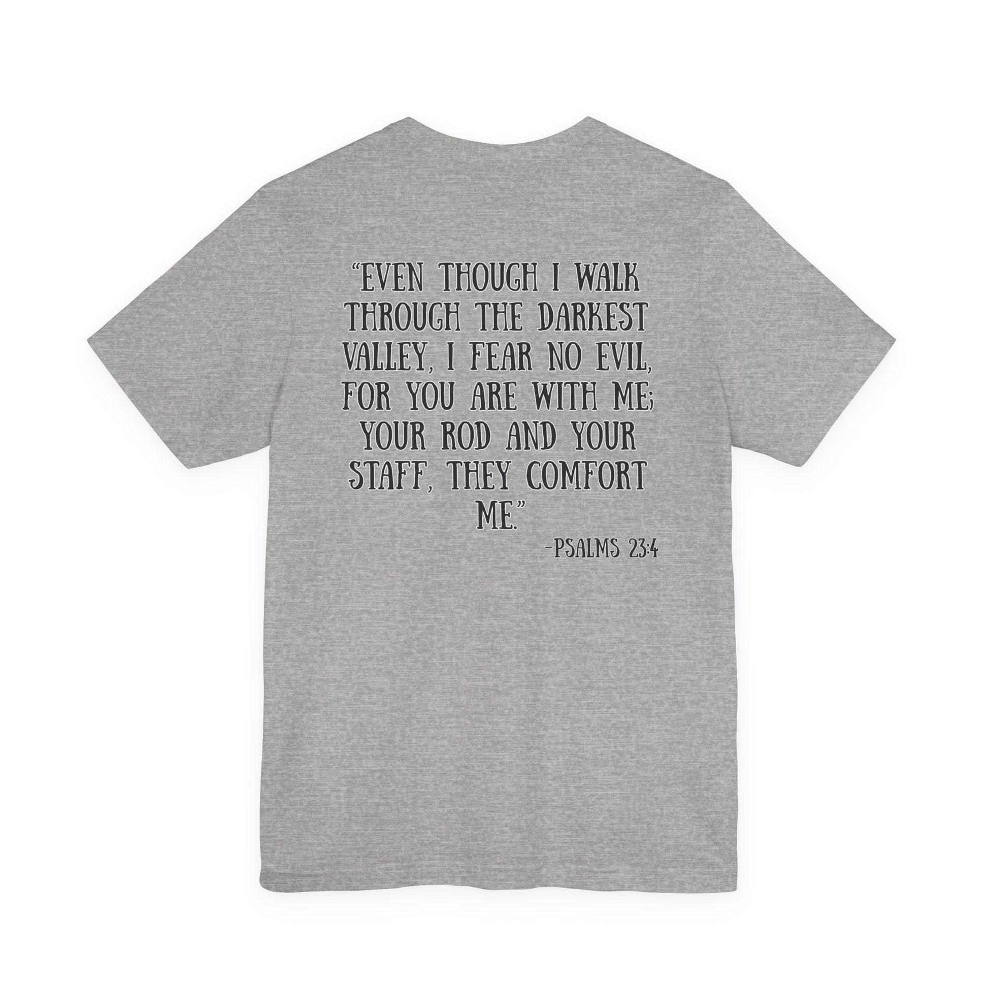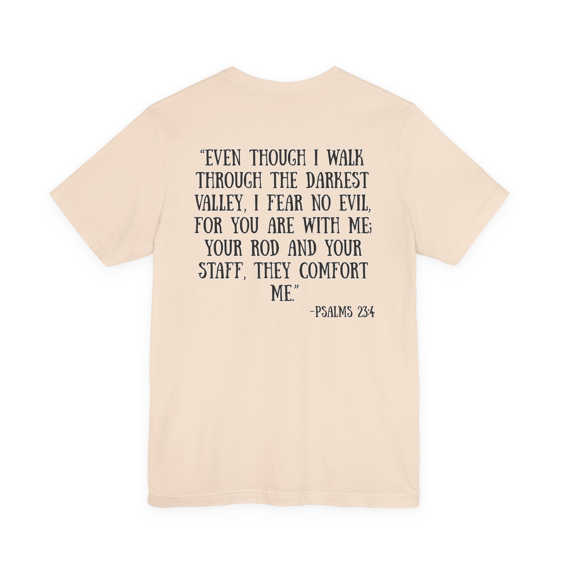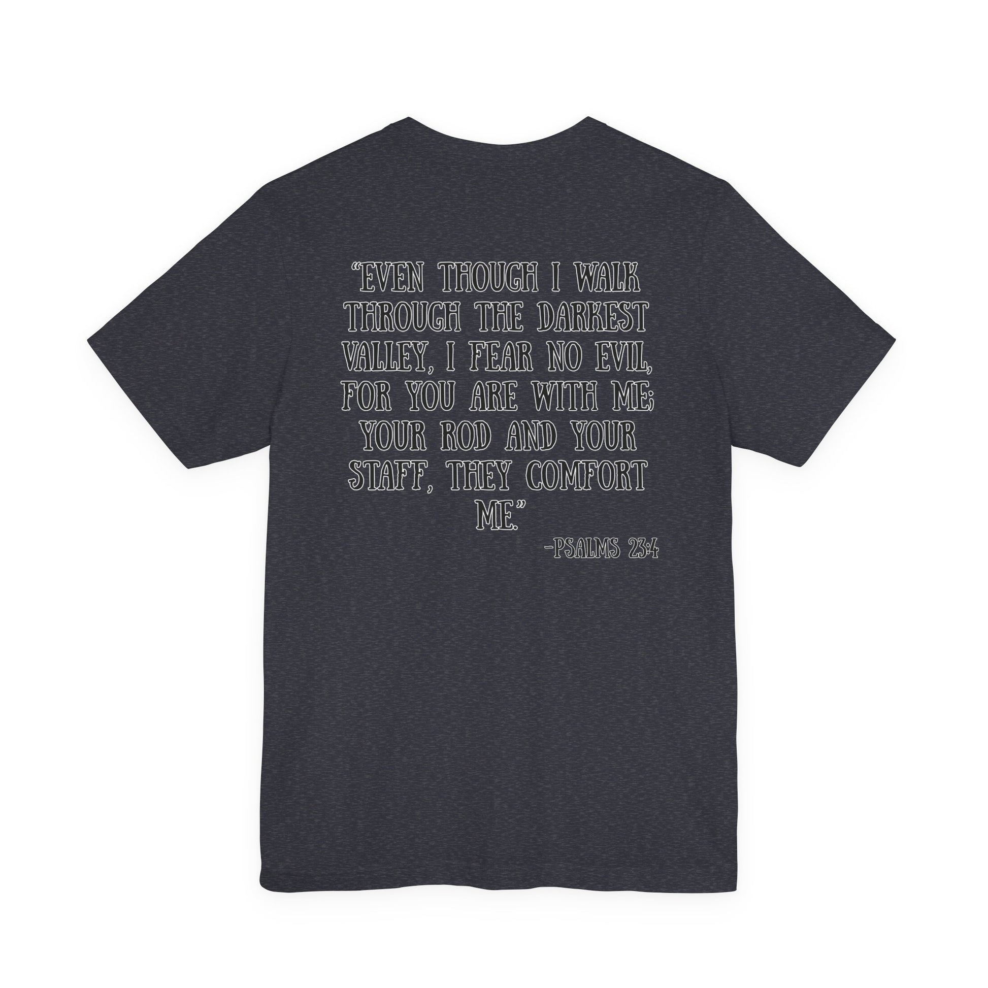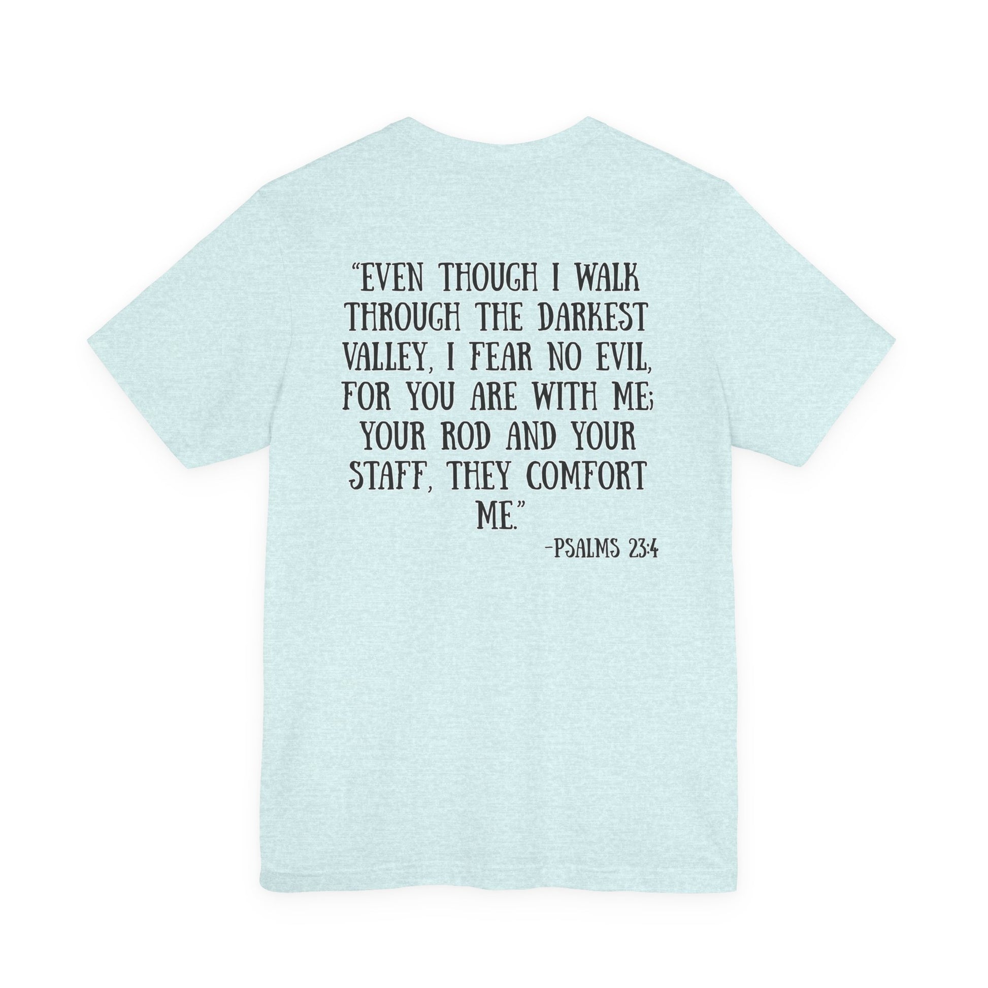 Soft, breathable cotton with a calm, reverent message — this tee carries Psalm 23:4 in a simple, hand-lettered style that reads like a quiet declaration of faith. The front holds a small, centered reference while the back opens into the full comforting verse, printed in a readable, slightly rustic type that feels personal and reflective. Lightweight and airy, the shirt layers easily under jackets or wears alone on warm days. Wear it to church gatherings, volunteer days, or moments when you want a gentle reminder of guidance and presence. It looks unassuming in white but also pairs well with muted heathers and earth tones, making it a subtle companion through daily routines and meaningful gatherings.