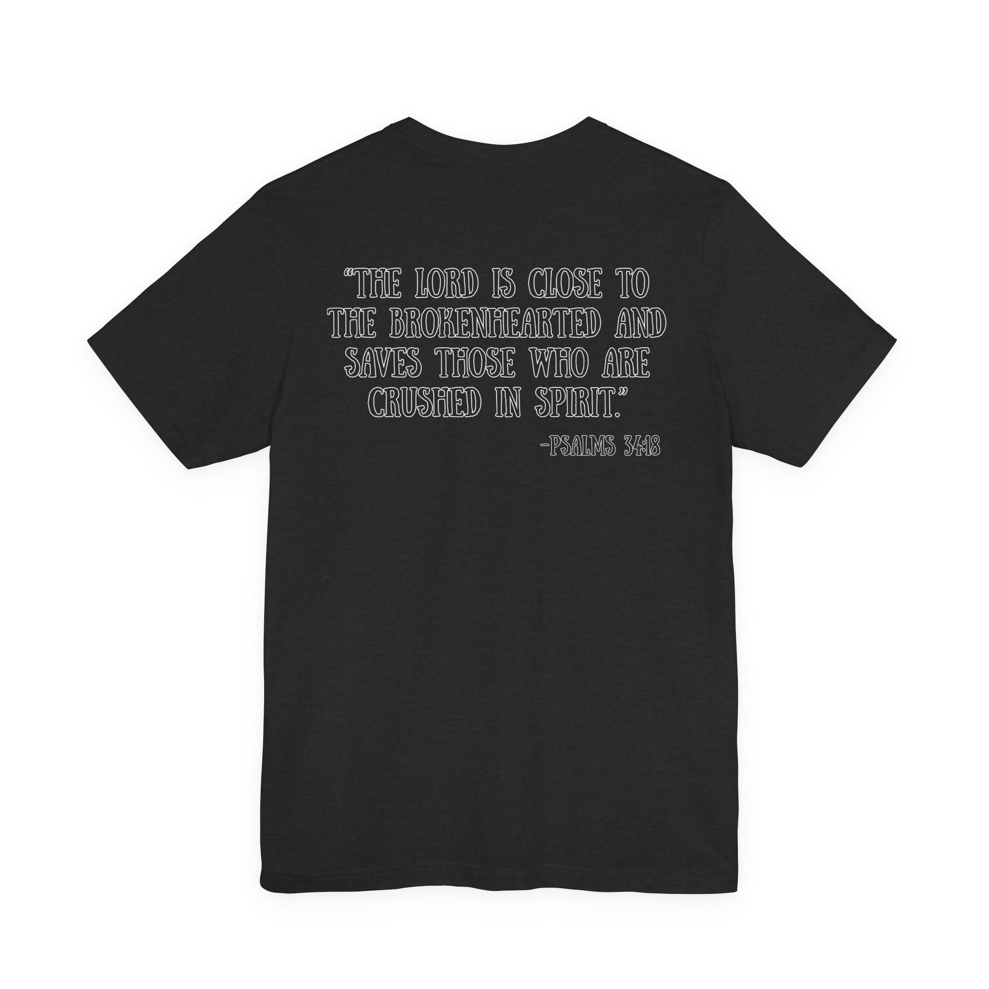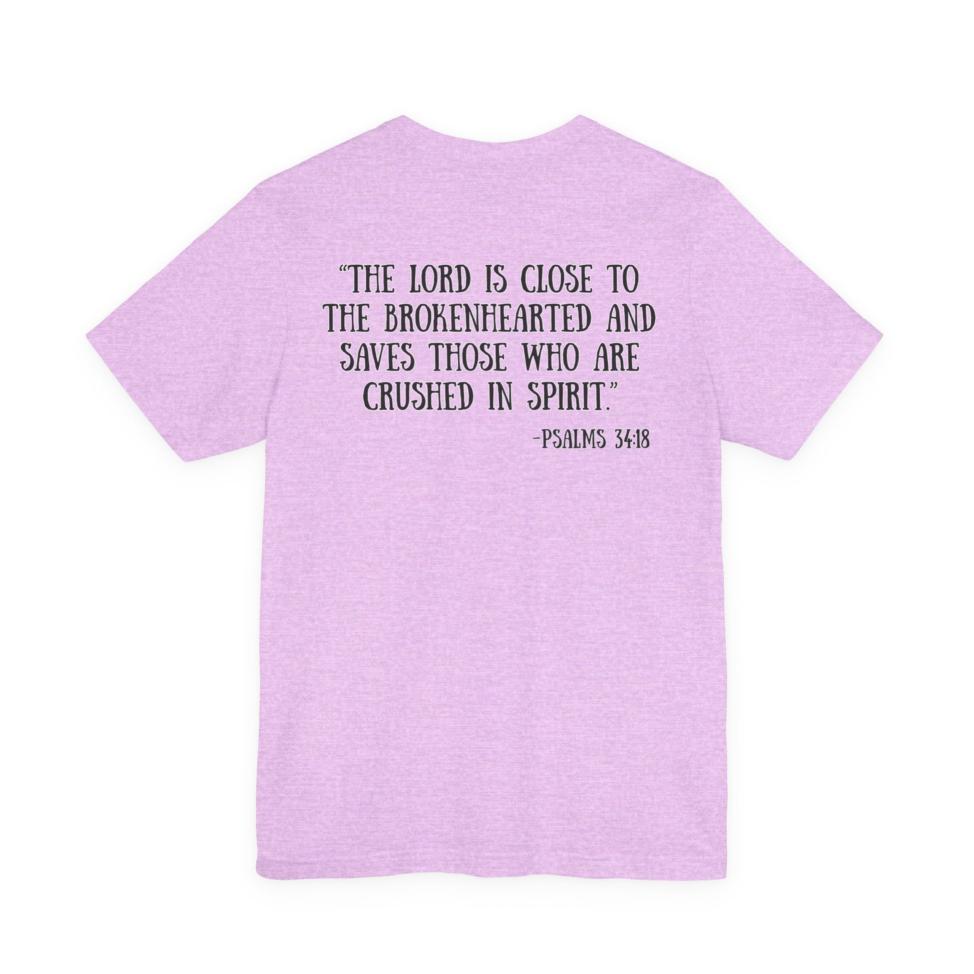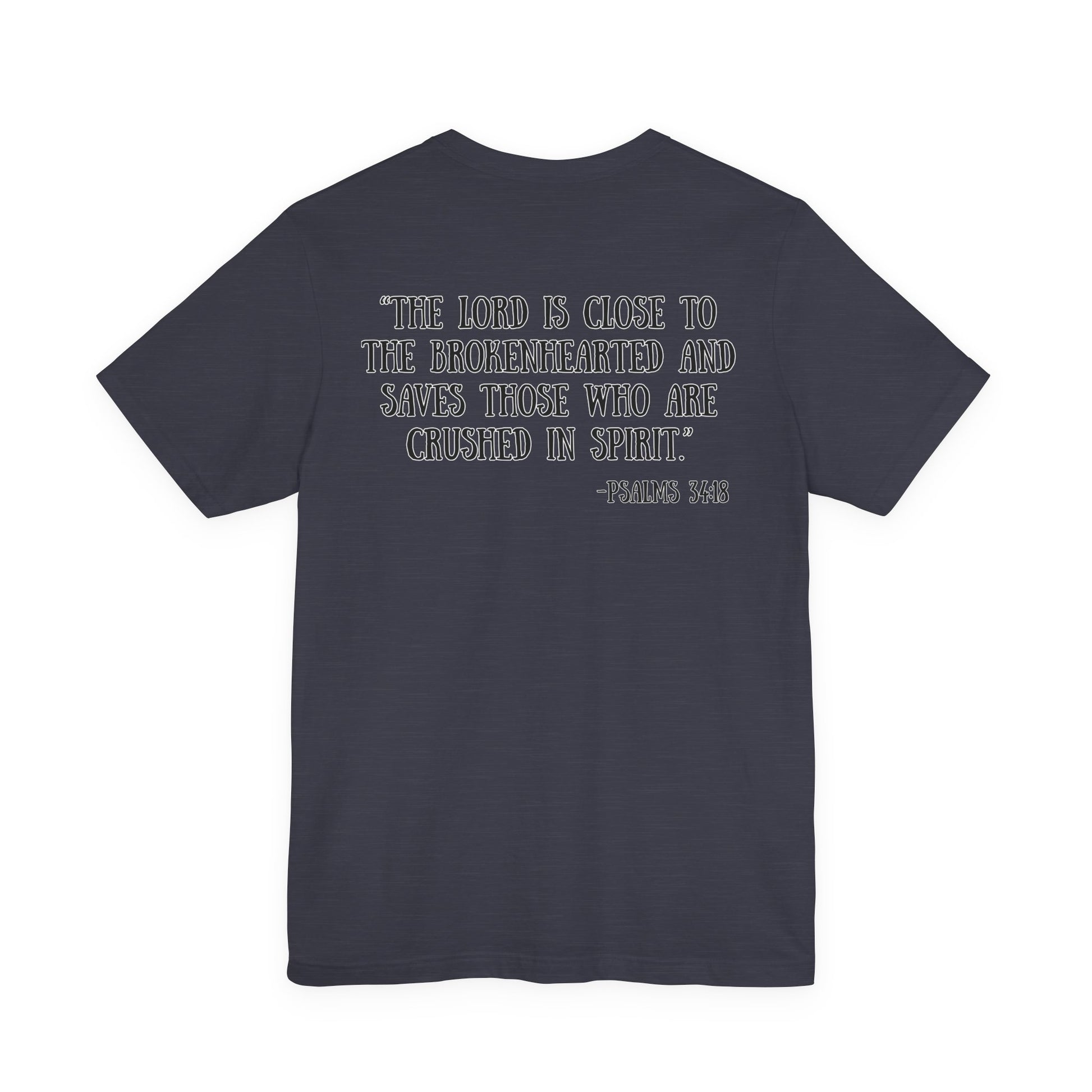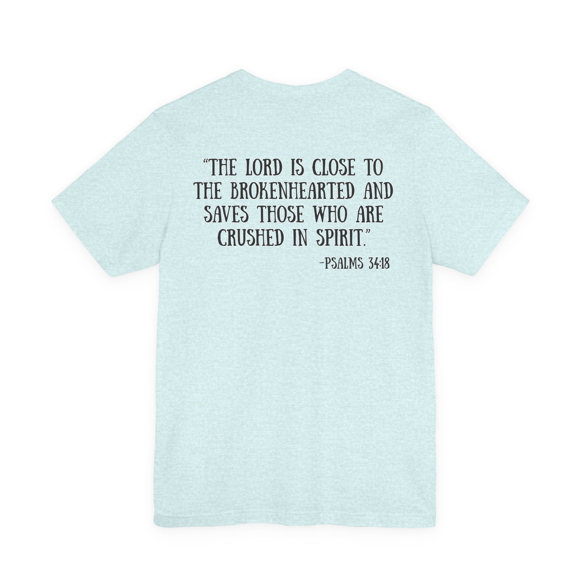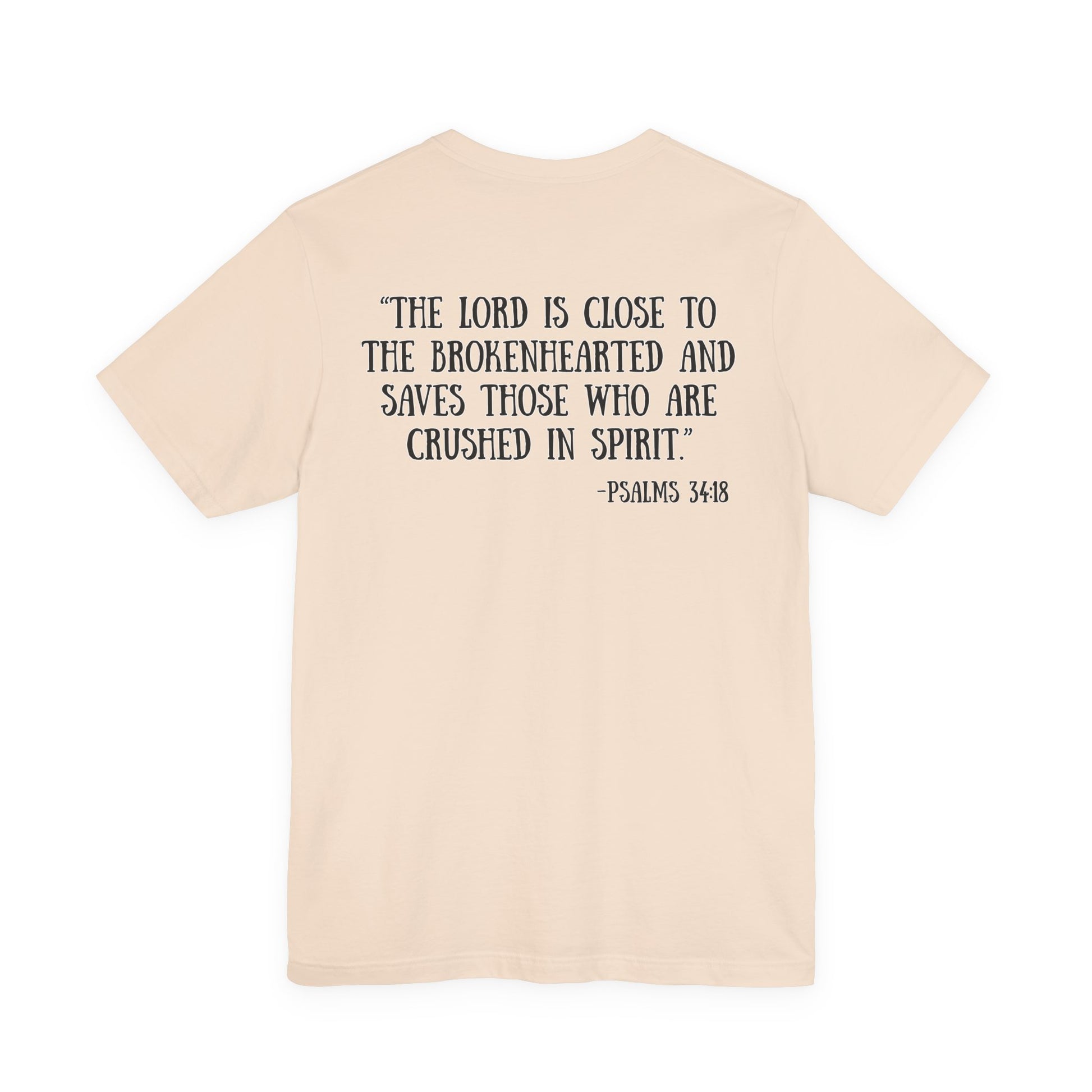 Soft, simple, and quietly confident — this lightweight tee wears like a warm exhale. The front bears a small, understated ‘Psalms 34:18’ while the back gently unfolds the verse: “The Lord is close to the brokenhearted and saves those who are crushed in spirit.” It’s crafted from 100% Airlume combed and ring-spun cotton for a breathable, smooth feel that layers easily or stands on its own. Built with side seams, a ribbed knit collar, and shoulder tape, it keeps its shape through wash and wear. The printed label and sleeve details are rendered with modern DTF/DTG methods for crisp, lasting type. This shirt settles into everyday rhythms — quiet encouragement for long days, Sunday gatherings, or nights when you need a reminder that you’re not alone.