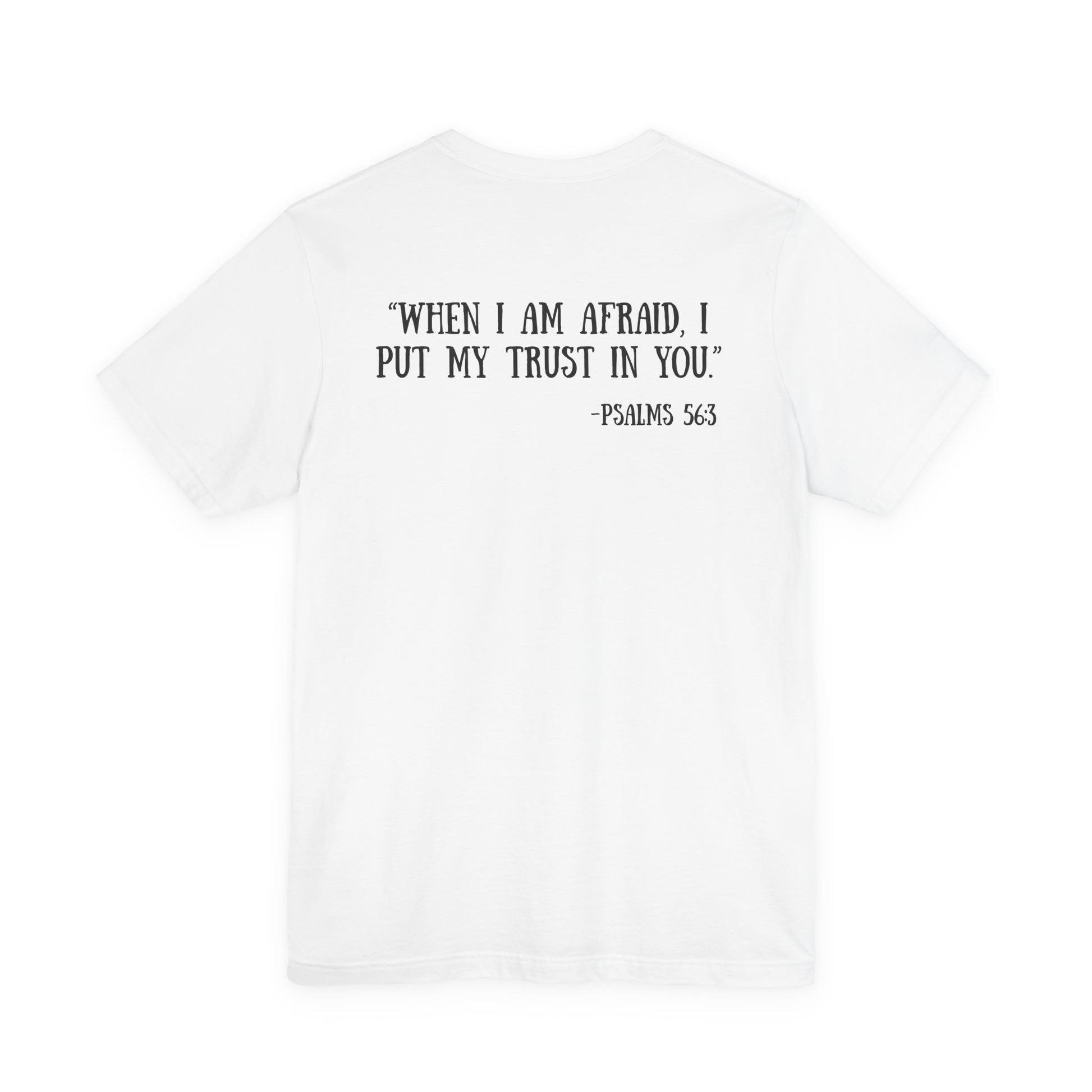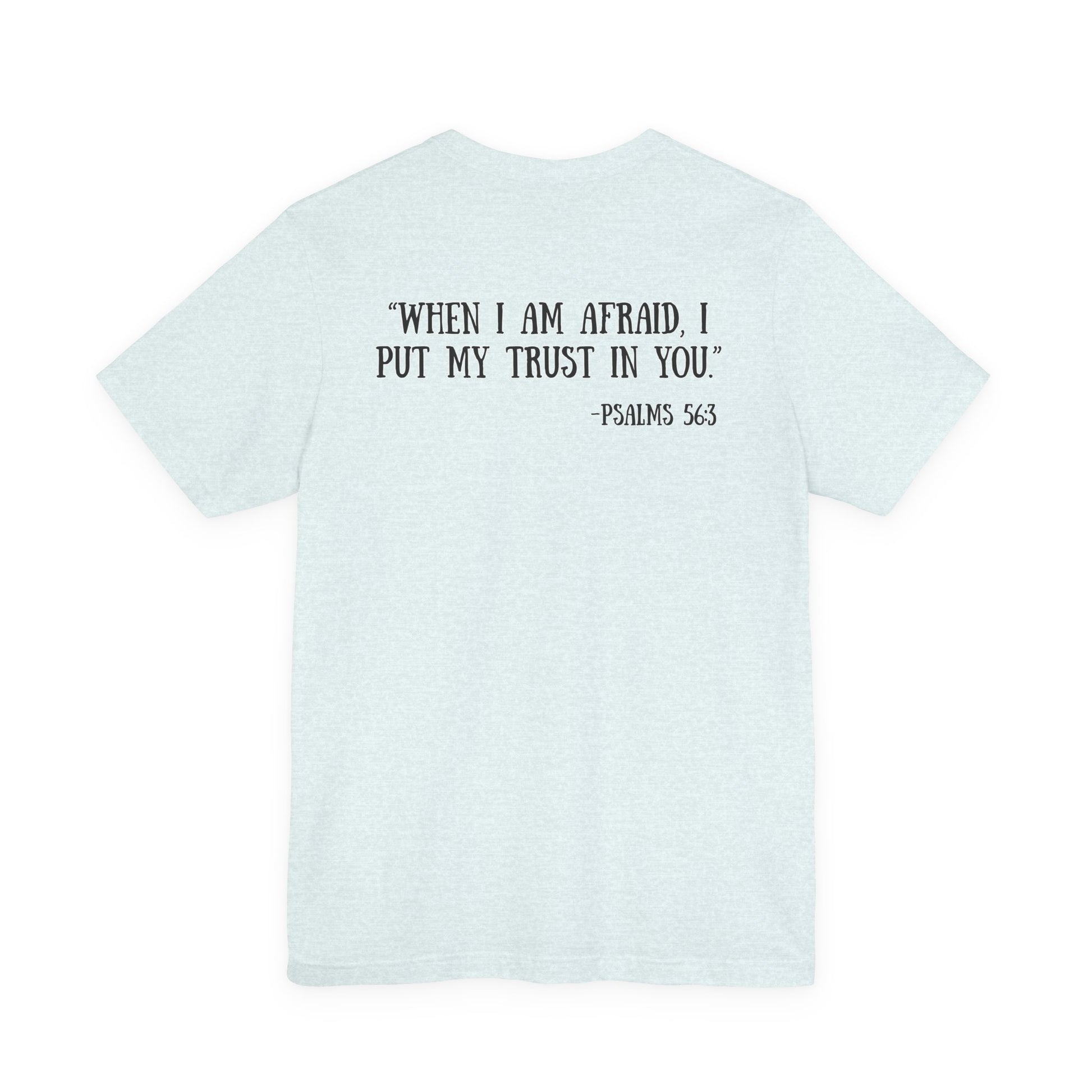 - Printed verse: front 'PSALMS 56:3' and back 'When I am afraid, I put my trust in You.' using DTF/DTG techniques for crisp detail